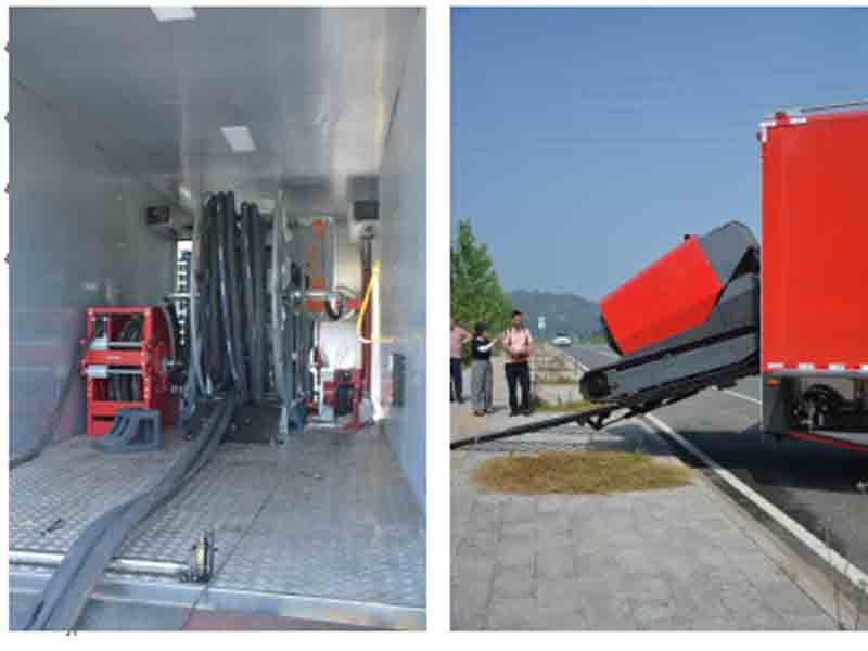 移動(dòng)排水泵站及液壓系統(tǒng)放置室:車(chē)廂中段用于停放液壓裝置、液壓油箱及放置油管絞盤(pán)。車(chē)廂后門(mén)為下開(kāi)式,行車(chē)時(shí)作為后門(mén),保護(hù)車(chē)內(nèi)設(shè)施,當(dāng)子車(chē)下車(chē)時(shí),可作為其階梯,使子車(chē)平穩(wěn)上下車(chē)。